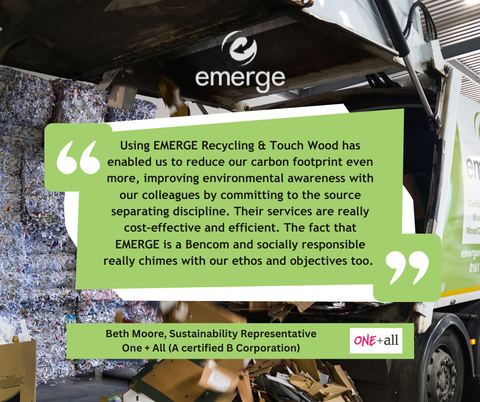 “Using EMERGE Recycling & Touch Wood has enabled us to reduce our carbon footprint even more, improving environmental awareness with our colleagues by committing to the source separating discipline. Their services are really cost-effective and efficient. The fact that EMERGE is a Bencom and socially responsible really chimes with our ethos and objectives too. As a supplier, they’re a great fit for us and we’re proud to work together” – Beth Moore, Sustainability Representative at One + All (A certified B Corporation)